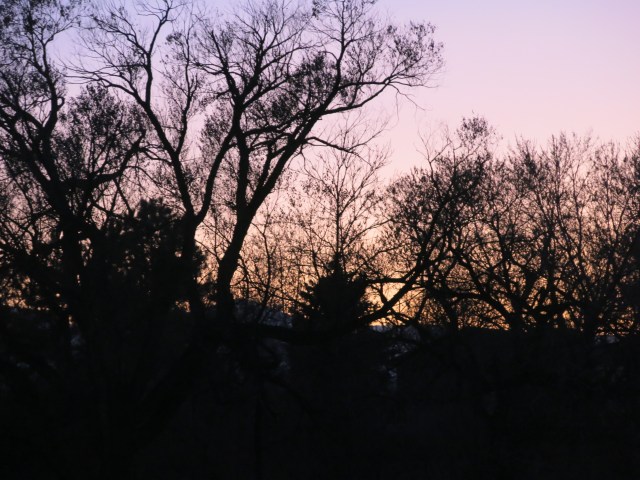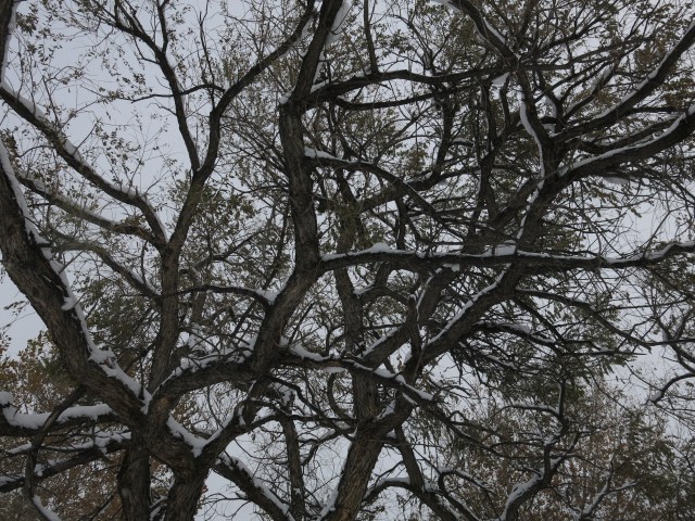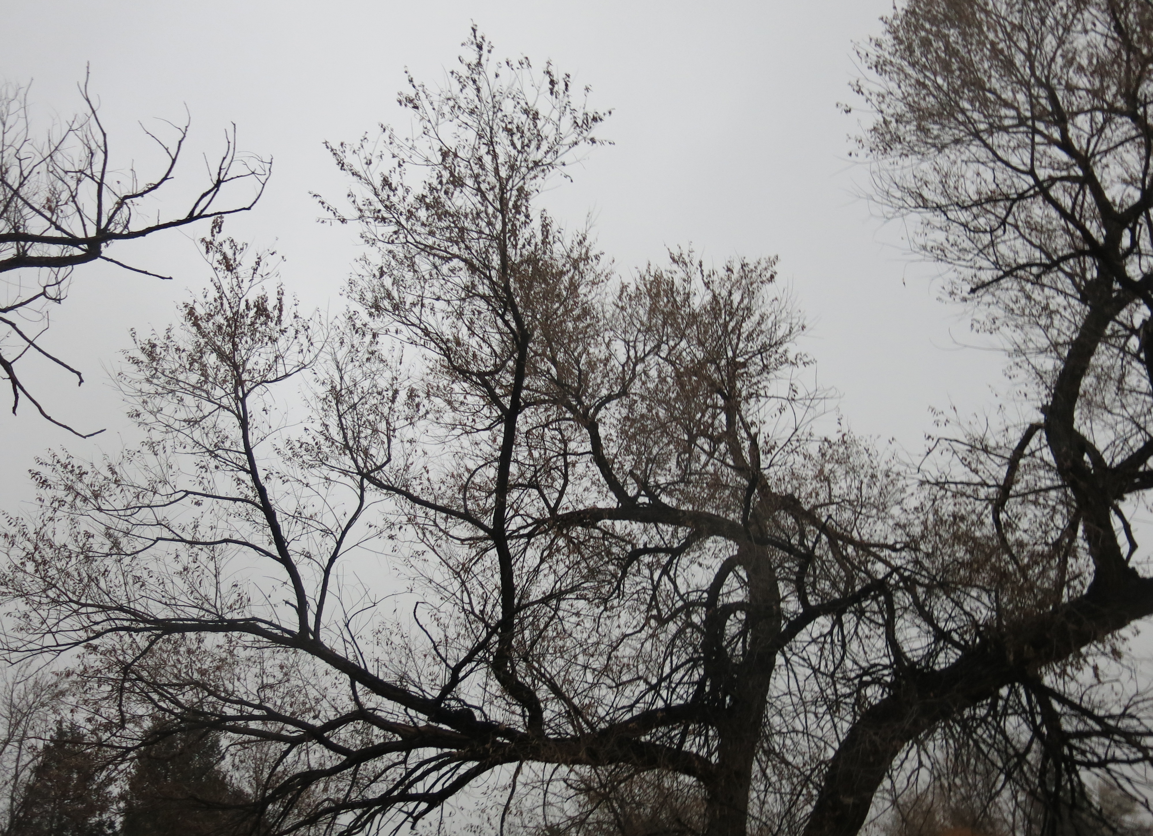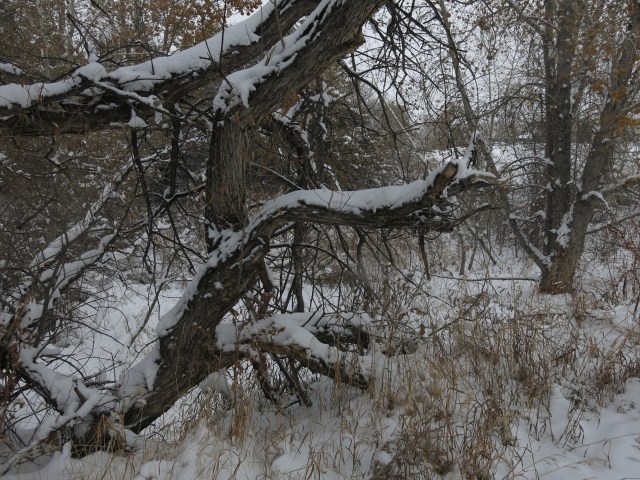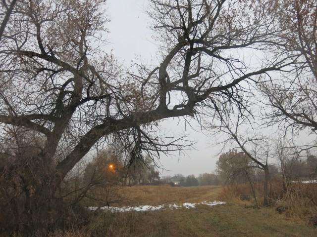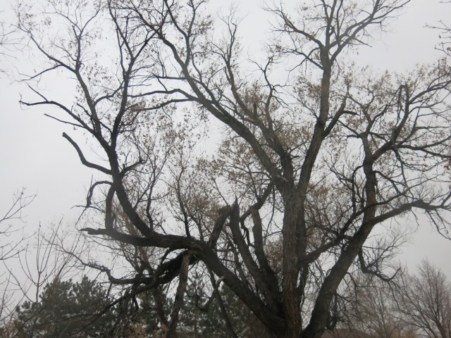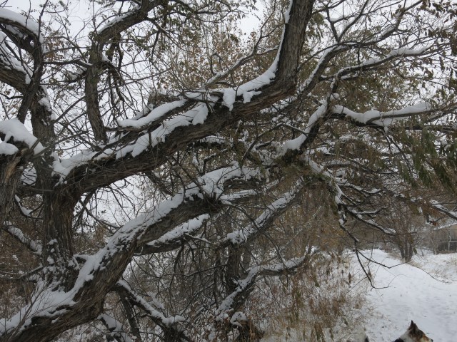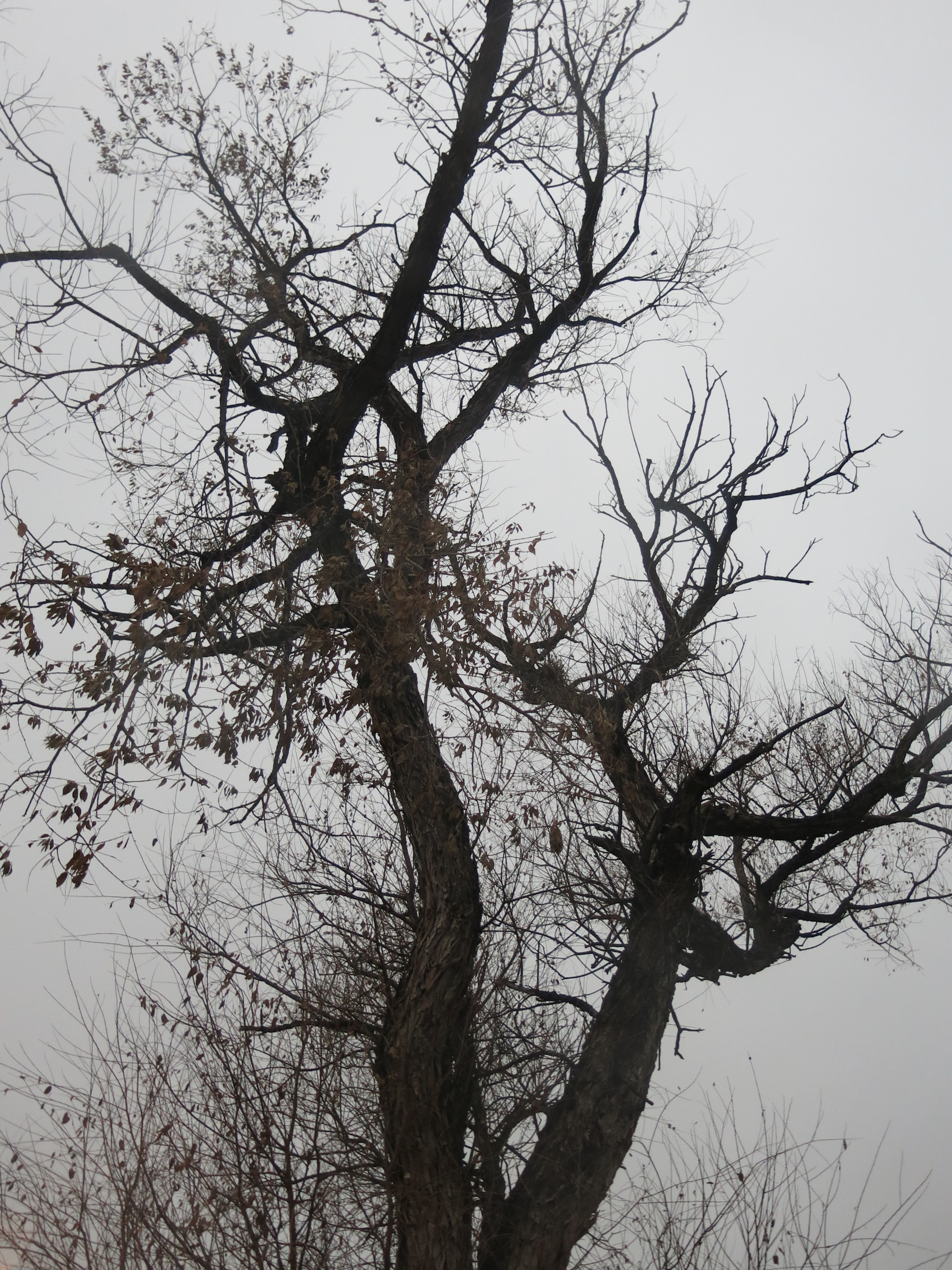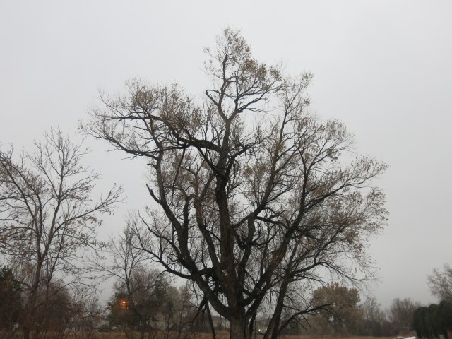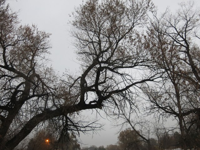 The weather has been mostly nice, ever since. The leaves in the big cottonwood didn’t turn, they’re just dried, and rattle in the wind. The sound is so loud we can hear it in the kitchen, with the back door open, of course. Sort of a rushing sound, like water from the creek going into the culvert.