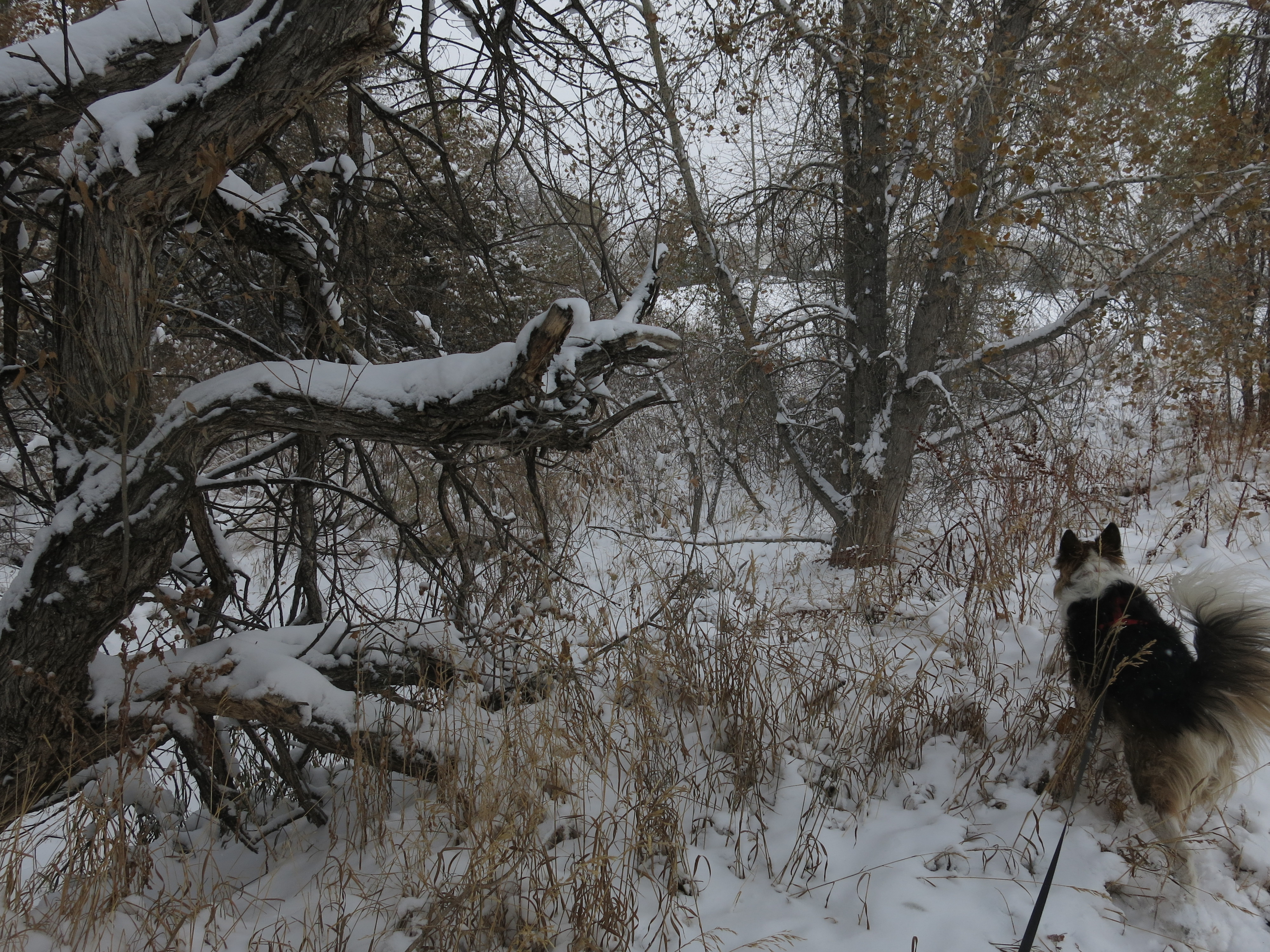 But I should go back to the couple of days before Halloween, to show how much it snowed, and how cold it got. Down to one degree, the night before Halloween. Of course I am super tough and like the cold, though my paws did ice up once or twice on my walks. The guy I live with reached down and cleared the ice from my paws, and we kept going.