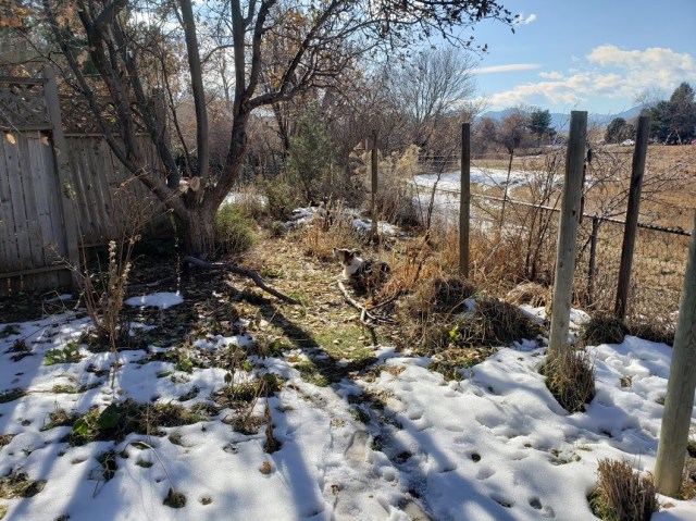 But the construction in the garden here, which was mostly done by his wife, is very satisfactory. The fence around the enclosure is sort of falling apart, but that can be fixed. You can see one extra-slanty bit right here. This picture was taken a couple of days ago, when the guy I live with sawed off a big branch on the apple tree that the snow had broken. Here I am guarding the piece of branch.