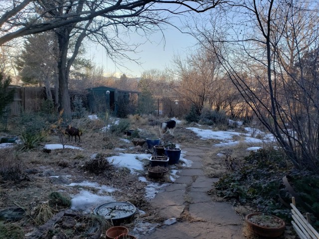 There are some pots in which there are no snowdrops up, and there was a lot of discussion about this (he talks to himself, and to me, but I don’t know anything about snowdrops), and also a lot of digging around in the pots to try to figure out why some were up and some weren’t. He discovered that in the pots where snowdrops were up, the soil wasn’t frozen, and in pots where the soil was frozen, it was because the soil mix in the pots had what he calls “store bought gunk” in it. Stuff he bought that came in bags. His definition of gunk.