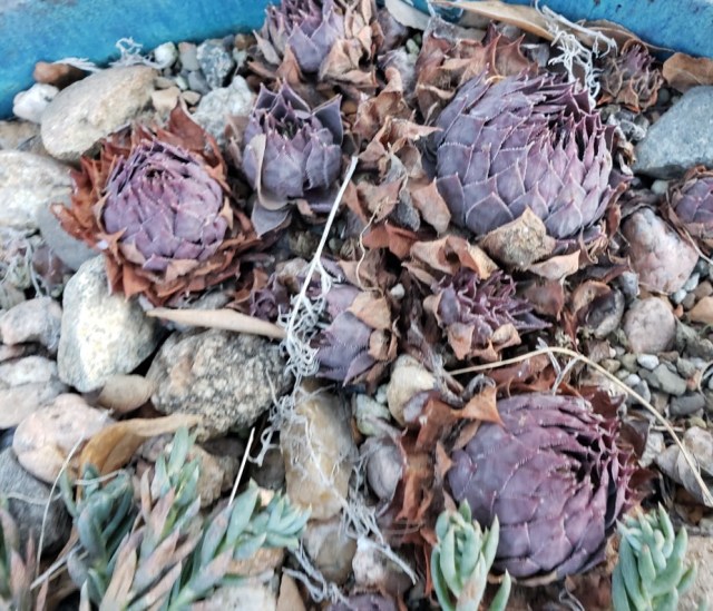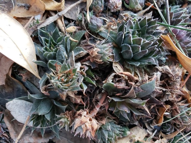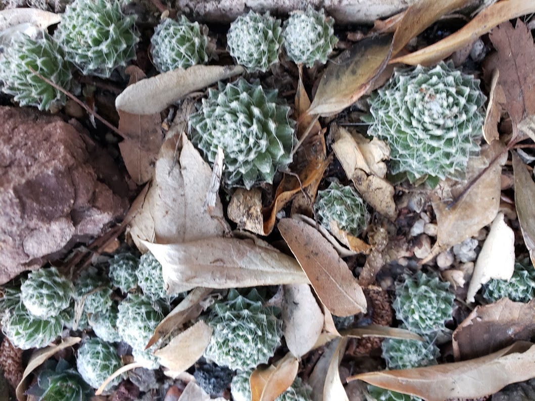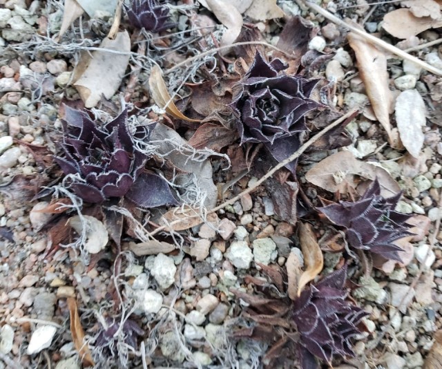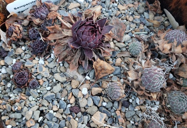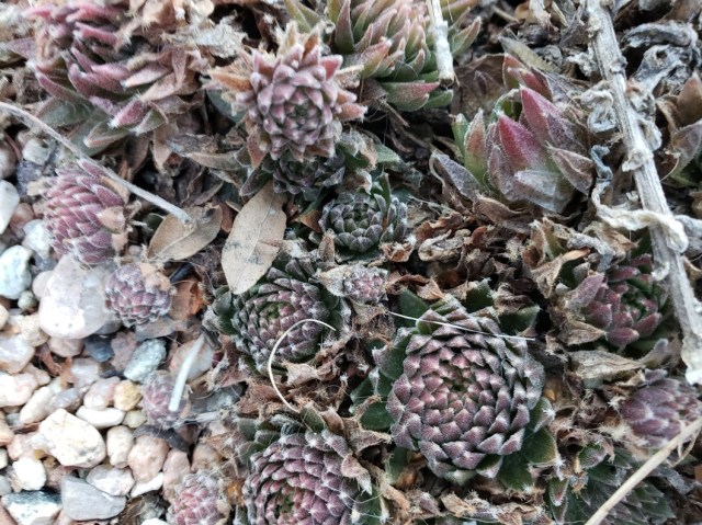 The kind of plum colored sempervivum that’s shaped, well like a plum, third from last. Do you know the variety? I like it. I guess it probably looks tightly packed like that only in the winter. Frozen soil, that’s depressing. You really can’t do a thing. I guess you thaw out bits here and there, right Mani? Always doing your part, right?