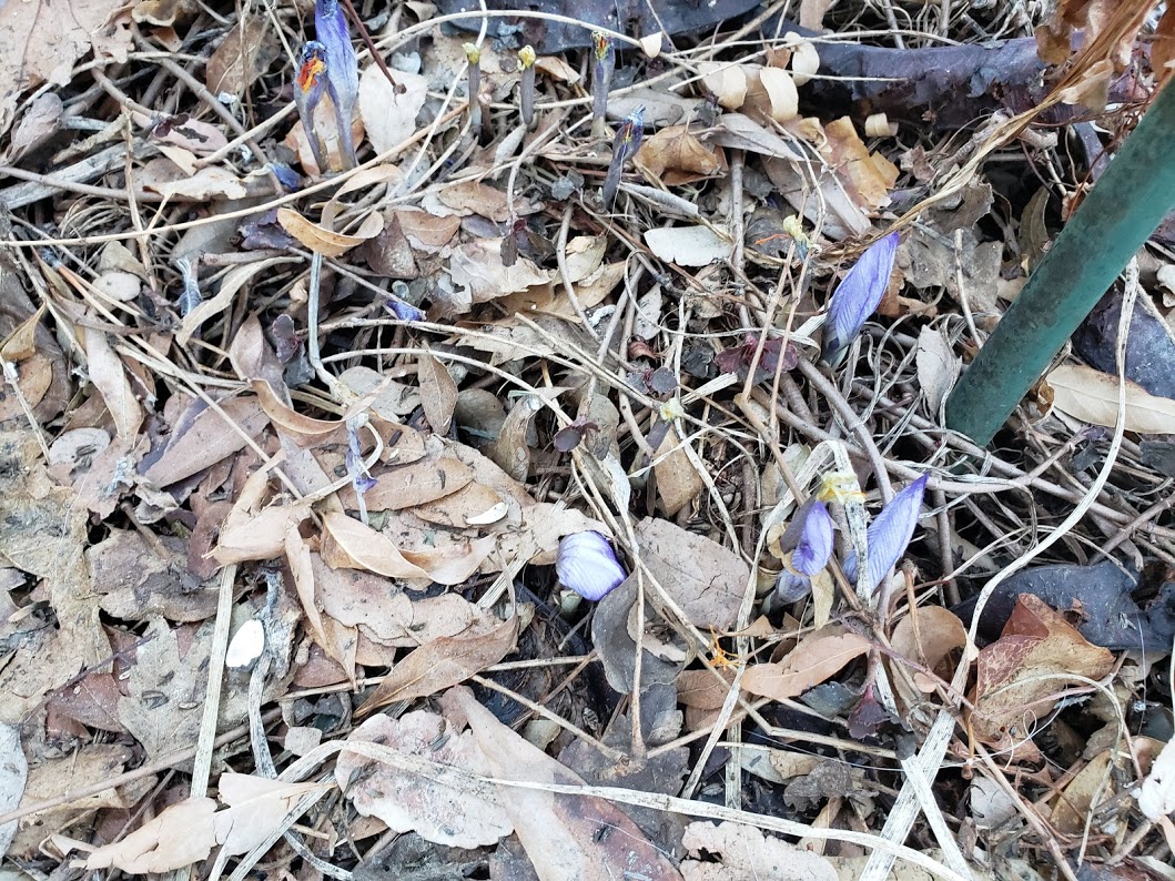 There are some crocuses which look like they’re about to flower but I think they froze and are just standing there. Sometimes they do flower at this time of year if it’s warm enough, and if the soil isn’t frozen. (I keep hearing this refrain about frozen soil.)