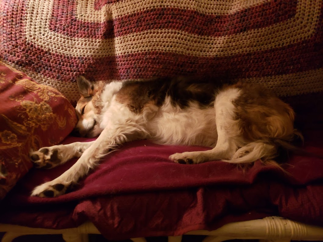 The couch is indeed ultra cozy. Made even more so by the new couch protector which you can see sticking out from under the fleece I’m lying on. But the couch does need new cushions.