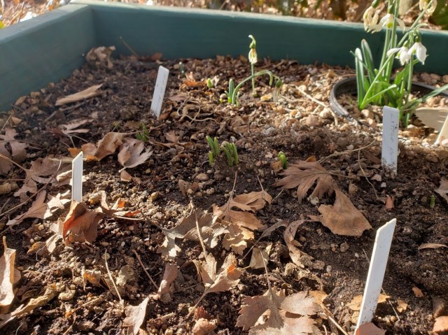 All of the snowdrops that are not up were planted directly into the ground, instead of the gallon nursery pots that the others are planted in. You can see that most are barely up. I imagine that moving the bulbs into pots will be a spring project. I’ll watch.