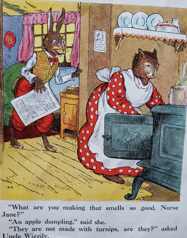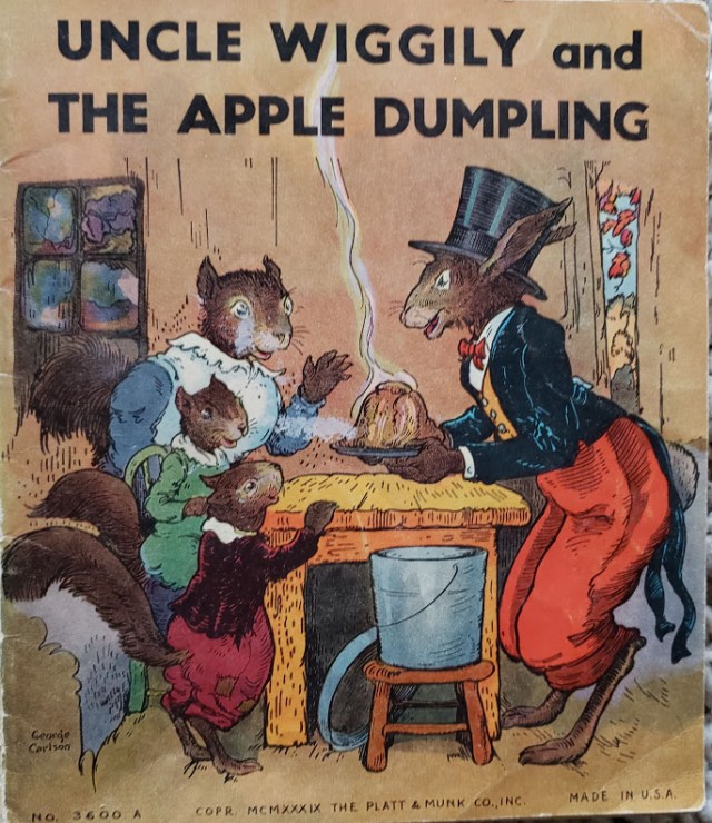 Like many others here we had Uncle Wiggily books, too, as a pass-along from my aunt. She was my mother’s much older sister, a teacher. So after her two children were grown she gave them to us. I and all five of my brothers loved them. My mother reading to us is one of my most cherished memories. She said it was just so she had a chance to sit down. Apple dumplings were also important in my family. That is what we had every Christmas eve for supper right before we got to open one present. I don’t know how that tradition started…maybe Uncle Wiggily?