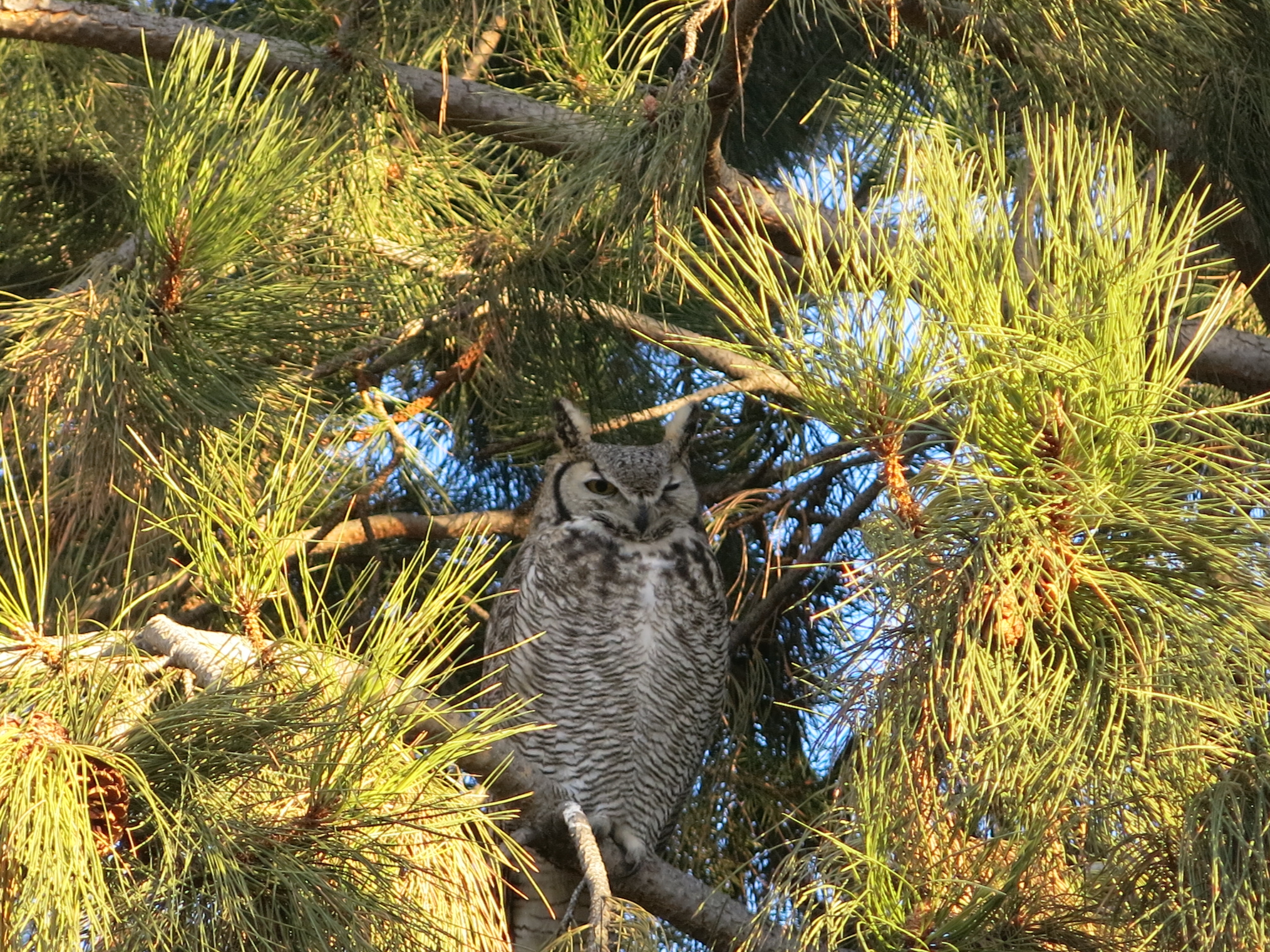 That’s it, for today. My evening walks have been just a little chilly, at least according to the person who walks with me, but we did see the owl this evening. We go at around the same time every evening, after my dinner, and you can see by the sun on the pine needles that the days are getting longer, which is good.