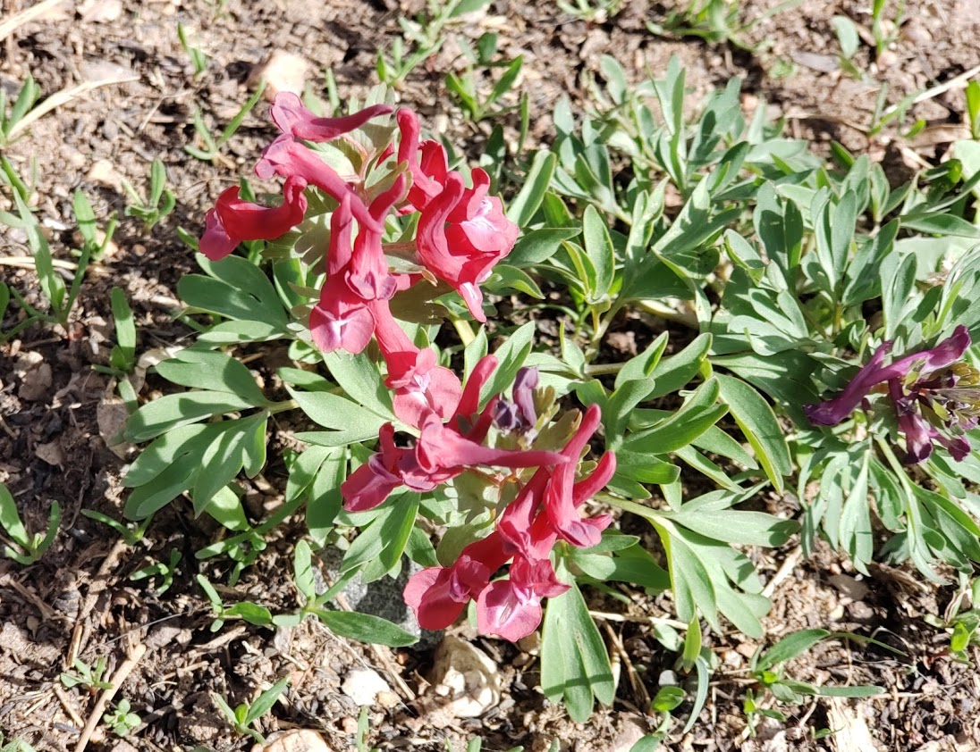 Last year there was this red corydalis seedling way out past where all the other corydalis are, which was kind of interesting, so today the guy I live with took a picture of it, and it wasn’t until the picture got posted here that he noticed the purple one next to it.