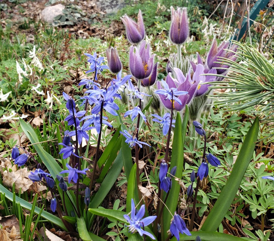 A pulsatilla, with Scilla melaina (possibly) in front of it.