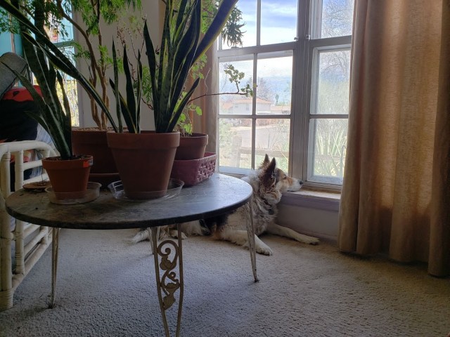 My not-pure-bred Border collie, Boo, would hate to have a low window like that! He’d see all sorts of things he’d rather not. Children walking to school. The mail truck in person, not just the sound. An ant on the glass. He is a nervous wreck in our own backyard! I say the guy you live with is very wise to still be staying in. I haven’t been out of the house (includes garden) or car in pretty much two months I go for car rides, like a dog! Fortunately, I have a son who lives with me who shops. He does buy strange brands though. He bought Boo tiny dog biscuits!