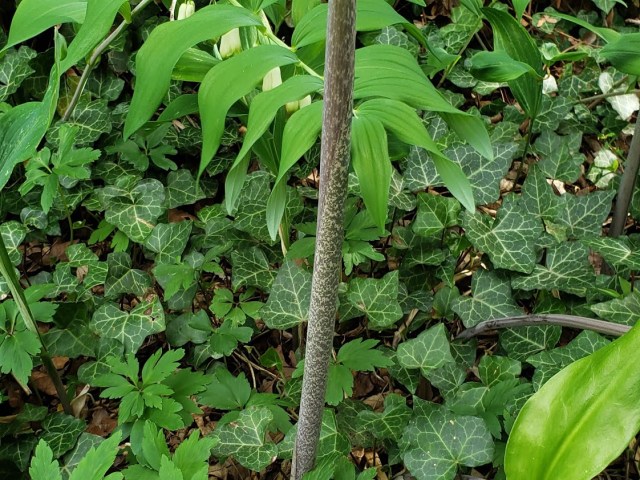 And the dragon arum, Dracunculus vulgaris, is still growing. That’s a Solomon’s seal, behind it, that came from his mom’s garden. She got it from her best friend who passed away years ago.Β