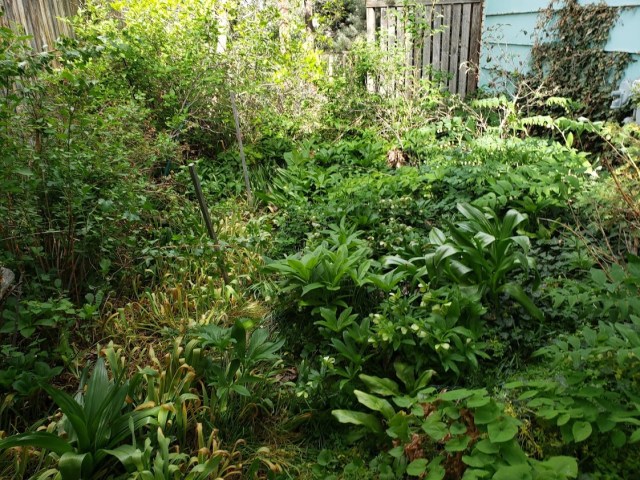 The shade garden is still green, though when the colchicum foliage turns brown the whole area will look a lot less green. The snowdrops, on the left, are already dying down for the summer.