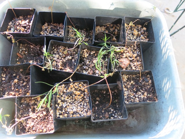 The other gardening thing–and there haven’t been very many gardening things to think about here at all, what with the heat and drought and the fact that the guy I live with hasn’t been very motivated at all, is the desert willow seedlings.