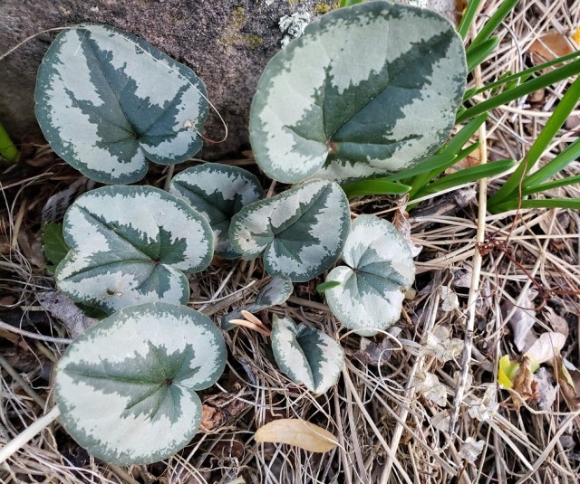 There are cyclamen, too. This is Cyclamen coum, which doesn’t flower at this time of year. It makes leaves now, that overwinter.