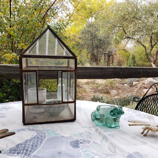 What else? Not much; the guy I live with cleaned out the “Wardian case” that sits on the patio table. His wife put the things in there and he’s tried to keep it like she had it, but some things, like feathers she found, disintegrated.