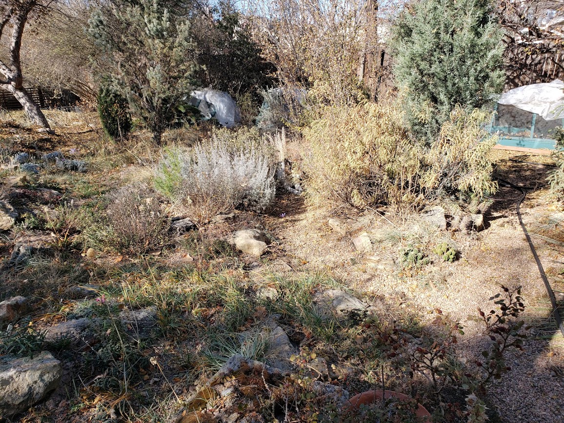 There are actually quite a few paths here. The one on the right, the one I’m guarding, and one that goes off to the left by the rock in the middle of the picture. That path turns and heads in the direction of the Russian hawthorn, but also breaks off and goes farther to the left, by the rocks in the lower left of the picture.