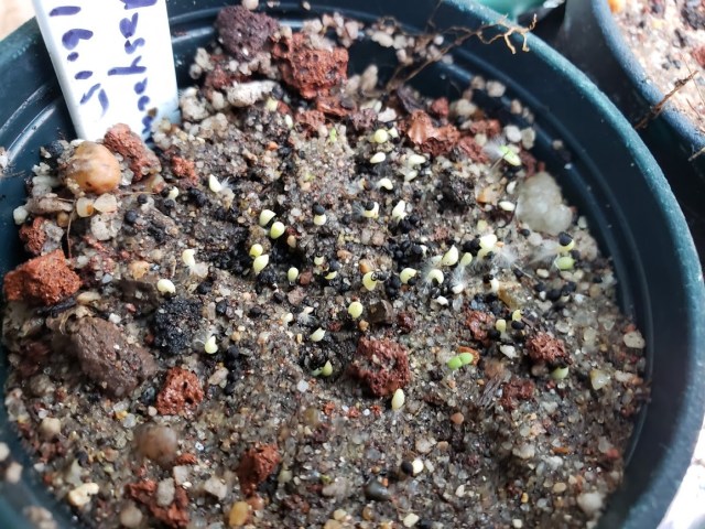 Those white things are the baby cactus. They’ll turn green pretty soon. There are some kinds that are better with the seed coat nicked (like with nail clippers), but these just come up, as you can see.