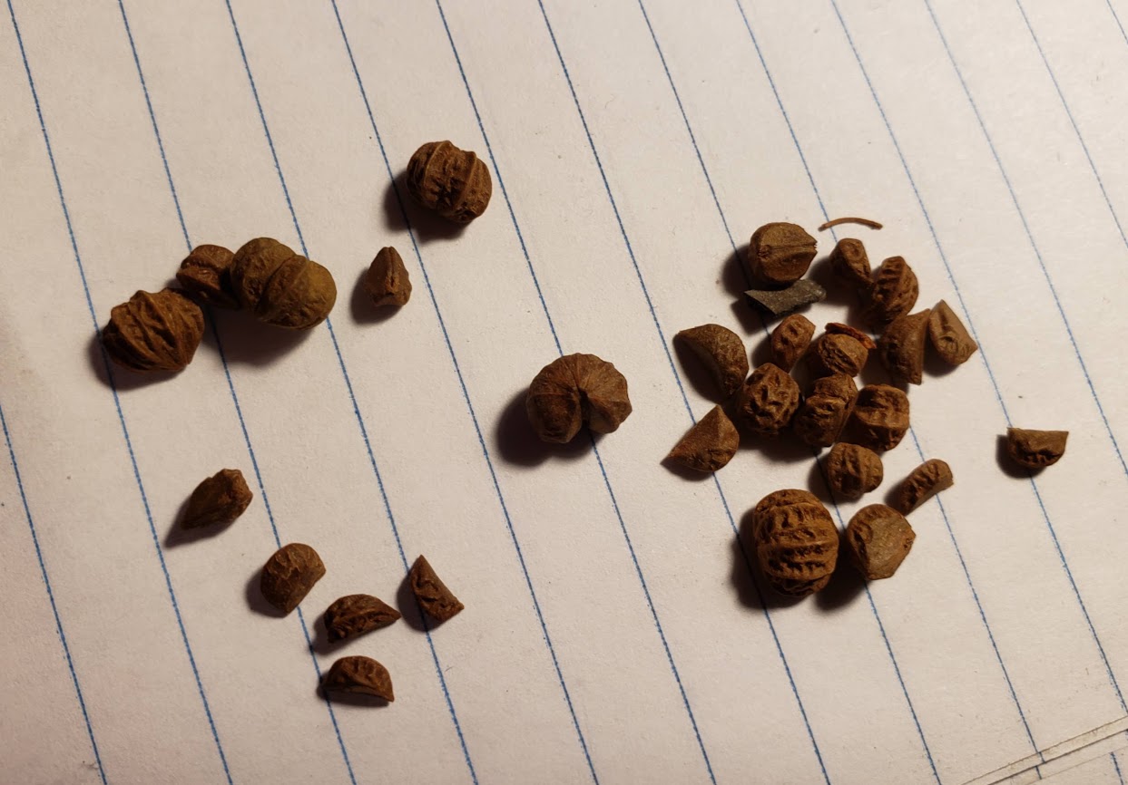 There are these to consider. Pretty old seeds of Arctostaphylos pungens. They can be germinated just by leaving them out for a couple of winters (though you only get one or two seedlings), but I guess the real way to do this is to soak the seeds in Liquid Smoke after doing all these other things. It simulates the chemicals leached into the soil after a fire, which is how the seeds germinate in the wild.