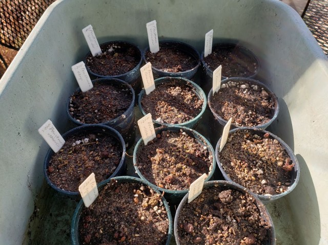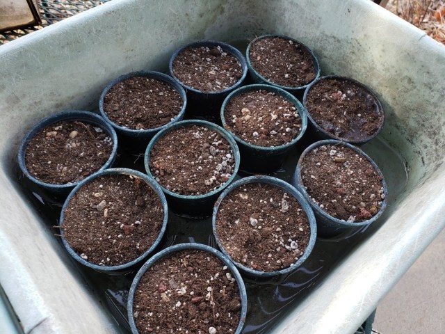 The seed pots (the same B.E.F. Grower’s Pots as always; they’re about thirty years old) are filled with a soil-less mix, which in this case is leftover stuff from last year and the year before. Some peat moss, coarse sand, perlite, and so forth.