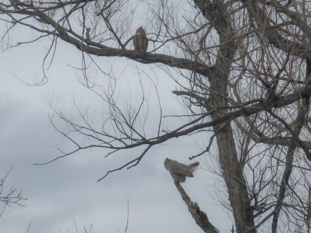 Here, the lower one is about to hoot. You can see how they raise their tail feathers; next they thrust their heads out and hoot away.