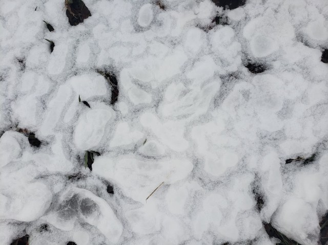 Looking at snow is pretty tiresome, but on one of our walks a few days ago there were these weird patterns in the snow. I think because it rained a little before it turned to snow.