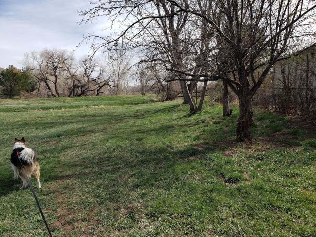 The coyote is on the canal road, just below the last tree on the right. You probably can’t see it, but I could. If you embiggen the picture, you can probably see the coyote.