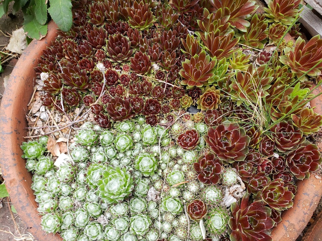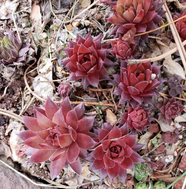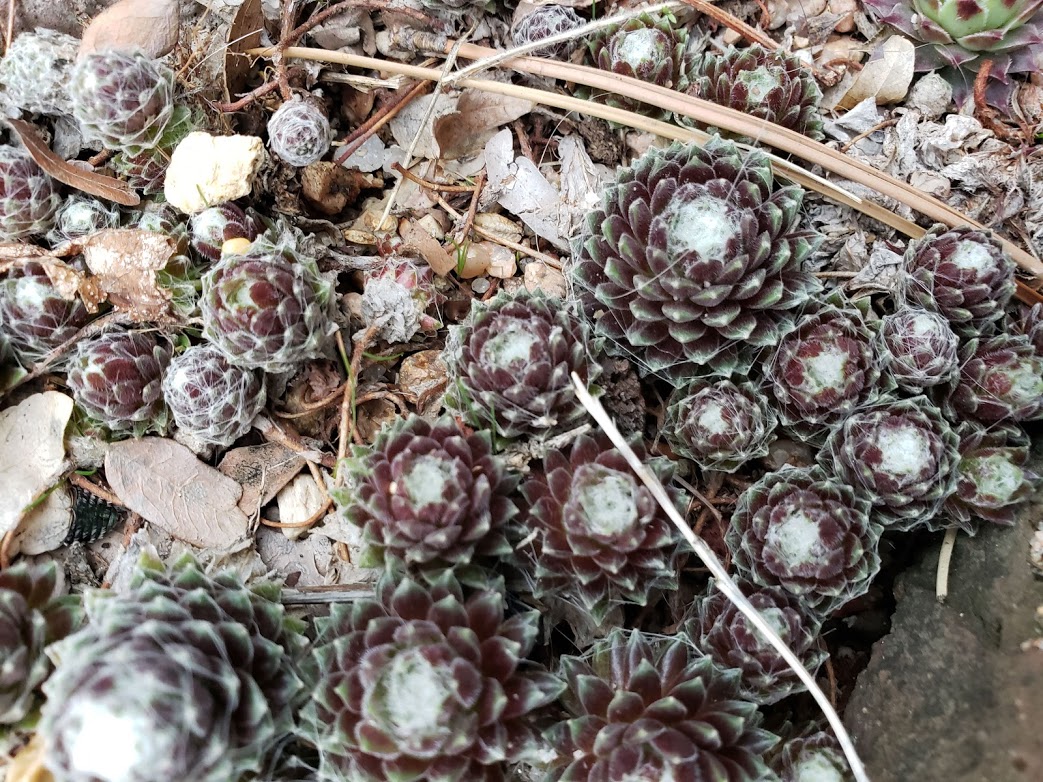 A box was delivered the other day. It had hens and chicks in it. I wondered if we really needed more hens and chicks, but the guy I live with said we did. They need almost no care at all, which is why there are a lot of them here.