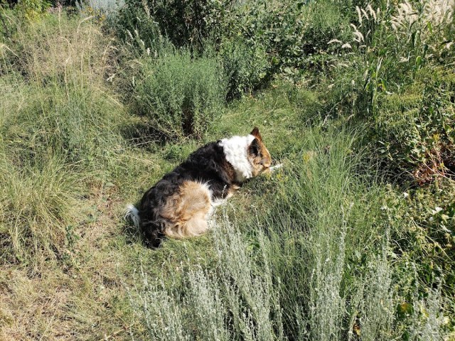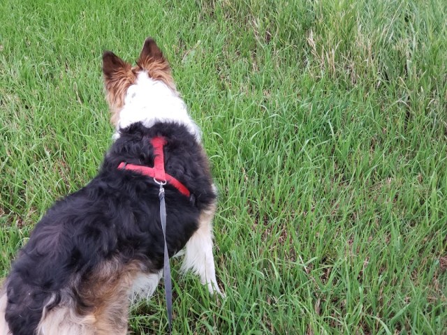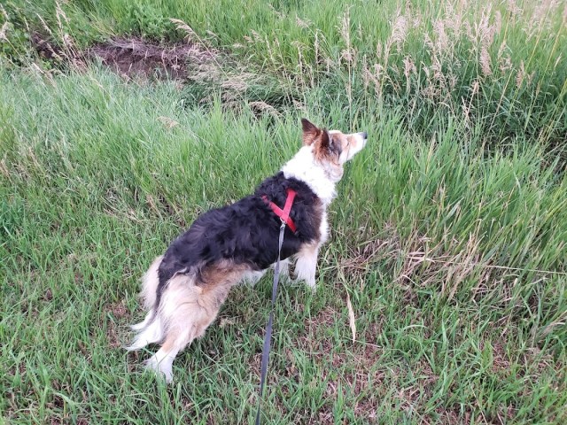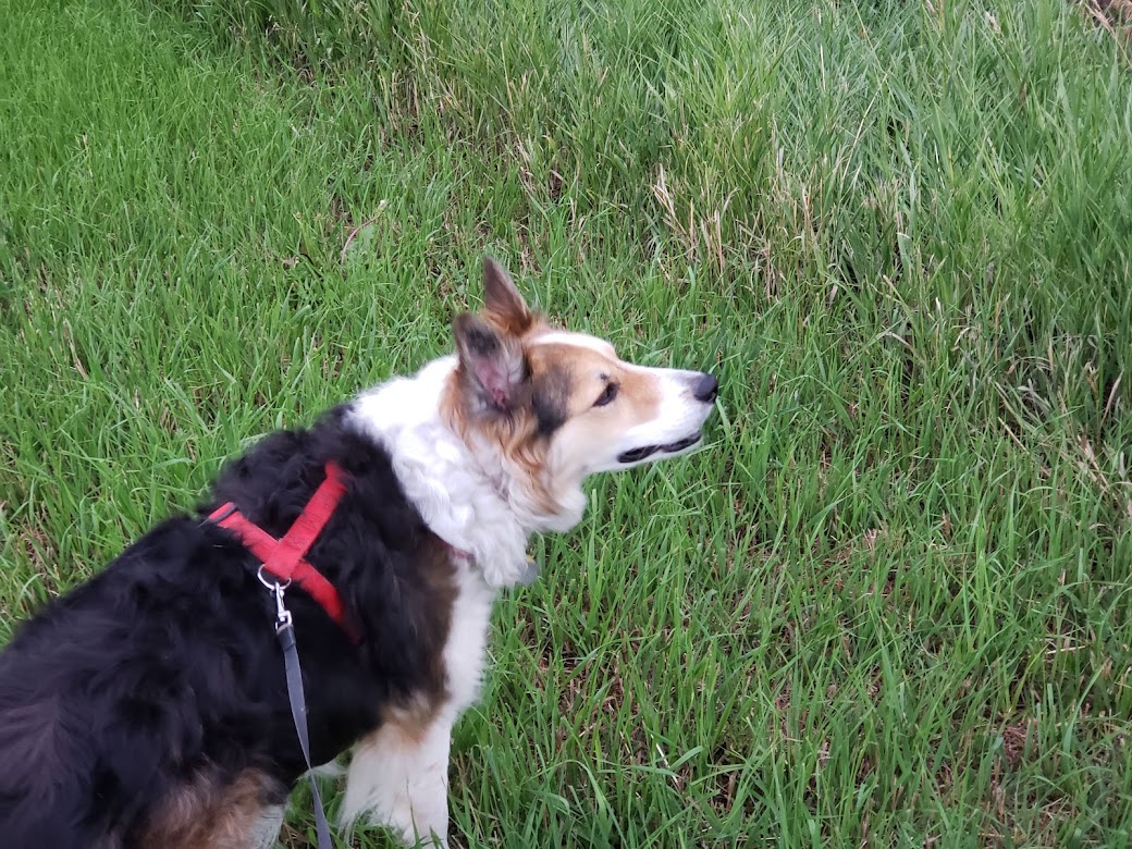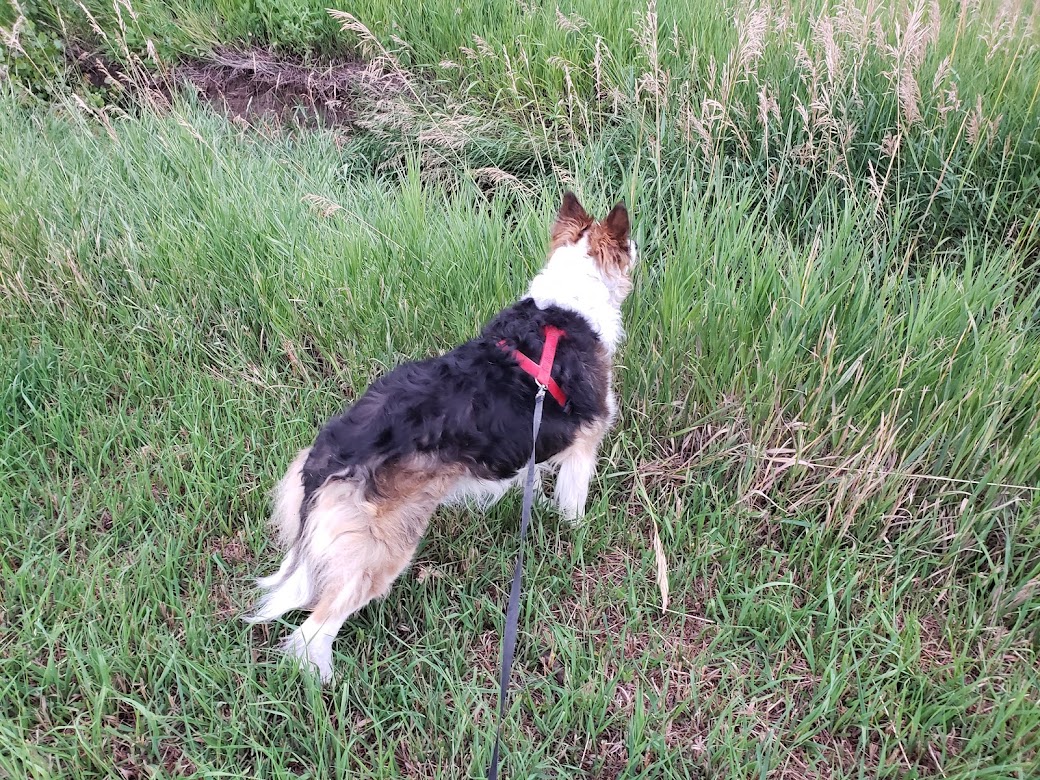 Your lovely summer coat is so curly! You were very wise to look and sniff and not bark at the “something moving through the grass.” Of course you were right! Although, my not-pure-bred Border collie barks and is on alert when the wind blows, which I saw in nothing, but we have to go inside anyway.