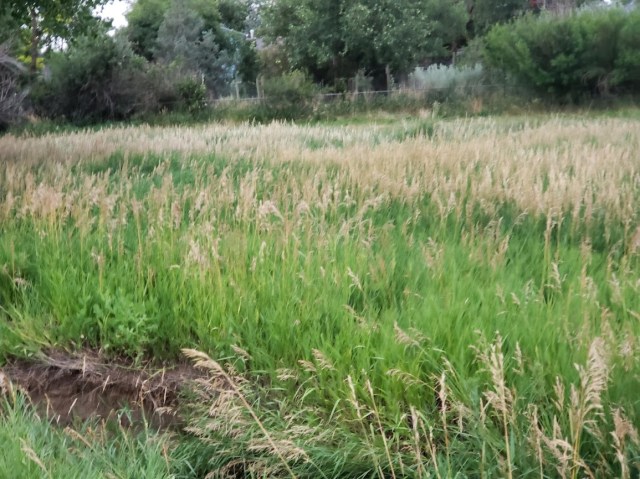 They mowed the field, I mean like seriously mowed, not just going over it like they did earlier, and it looks very different now. The smooth brome is flowering. This is the grass that the guy I live with really detests. It’s spread all over our garden. But it looks okay here. You can see the creek there, too. It’s dry right now.