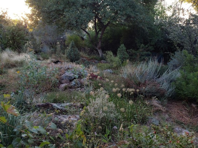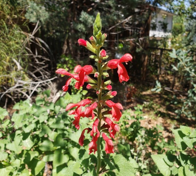 The guy I live with said that a “monsoon garden” might be a nice thing; an area that gets extra water for plants native to that part of North America, especially ones that hummingbirds like. (The salvia is native to Galeana in Nuevo LeΓ³n; it gets about twice the rain we get at this time of year.)