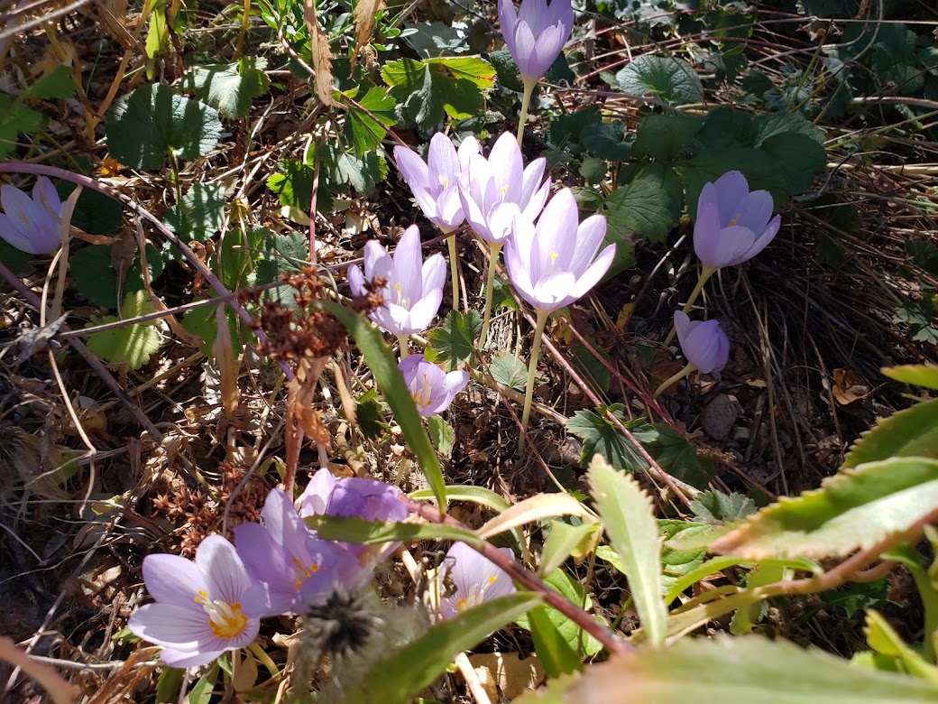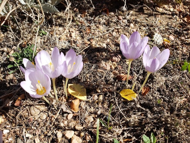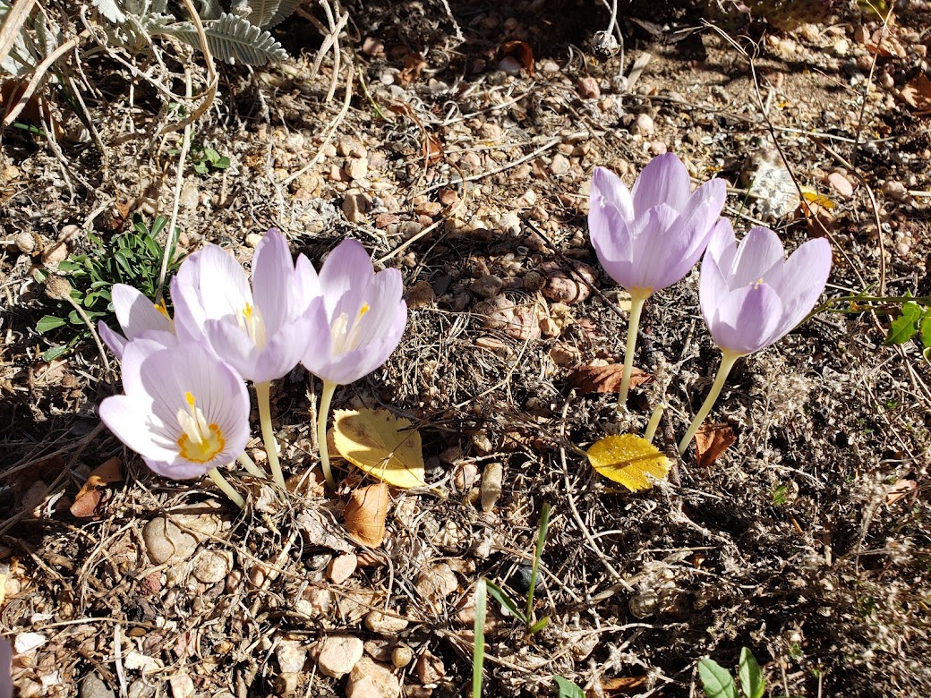 There are some crocuses in flower. The guy I live with has been watering, a little. These are Crocus kotschyanus.