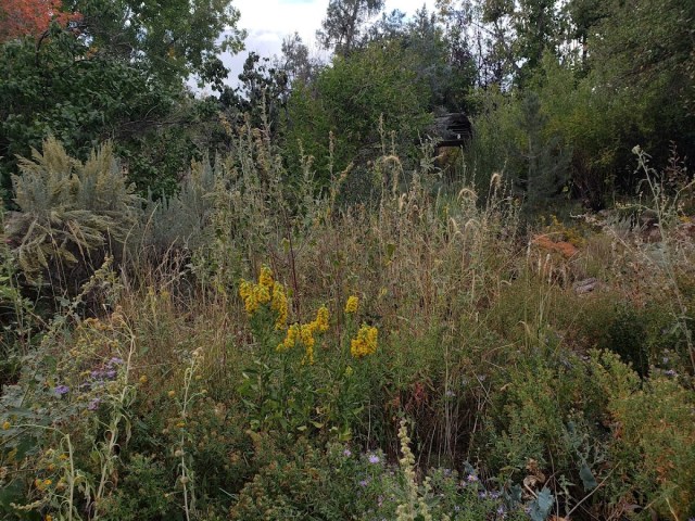 That’s Solidago ‘Wichita Mountains’ in flower. The guy I live with thinks this is just a form of the variable Solidago speciosa, but since he doesn’t know one goldenrod from another, this name is fine. It comes from the Wichita Mountains in Oklahoma. Bees love it.