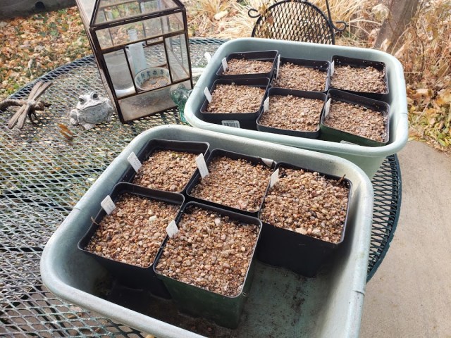 The gravel on top of the pots, if you didn’t know, is called “squeegee”, for reasons I don’t know. I know I’ve mentioned this before. It’s becoming harder to find. There used to be a couple of nurseries that sold it in big bags.