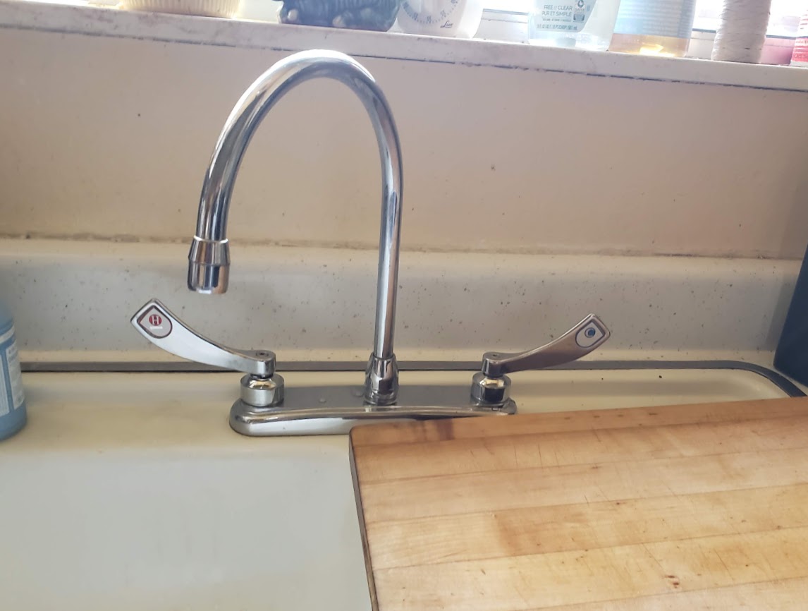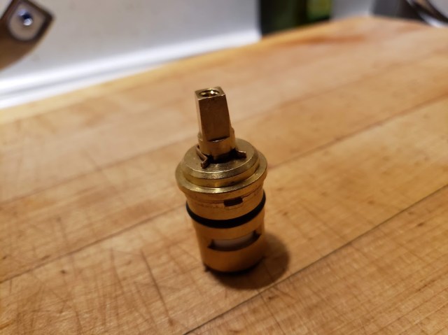 So yesterday, he shut off the cold water, spent about half an hour removing the faucet handle and hub, pulling out the cartridge, which of course didn’t just come out when he pulled on it with a pair of heavy-duty pliers, replaced the cold water cartridge, put everything back the way it was, and turned on the cold water.
