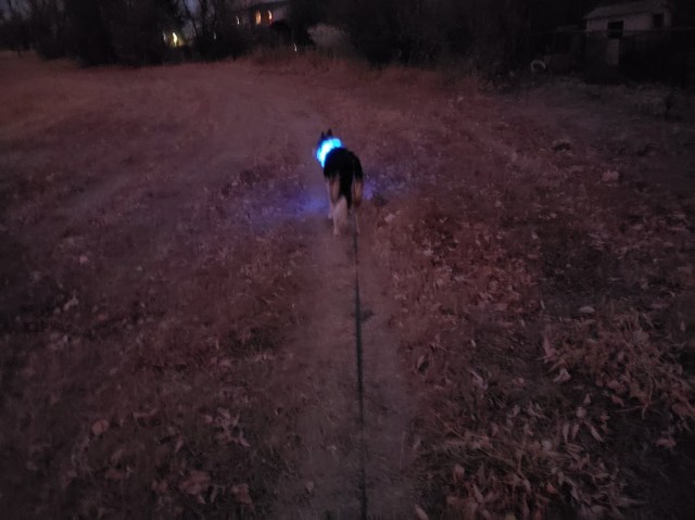 I’m sure everyone in the neighborhood is jealous of my new night-time collar. They’d have to look out the window, though, because we walk in the dark, now.