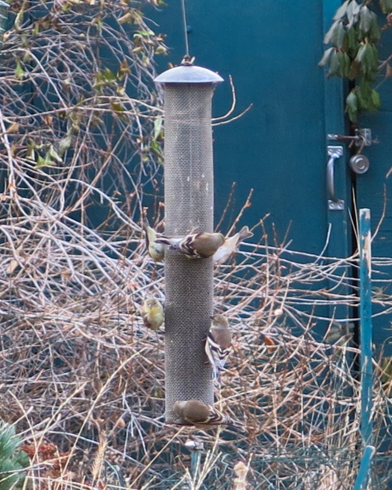 The guy I live with moved one of the steel feeder stands and put up the other “thistle” feeder, and so now the goldfinches have two feeder choices.