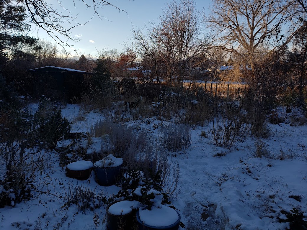 The snow fell early yesterday morning; when I woke up there it was, on the ground. Neither of us could believe it. Only about an inch (2.5cm) fell, but maybe it will melt into the ground instead of evaporating, the way is often does. That’s called sublimation, if you needed to know.
