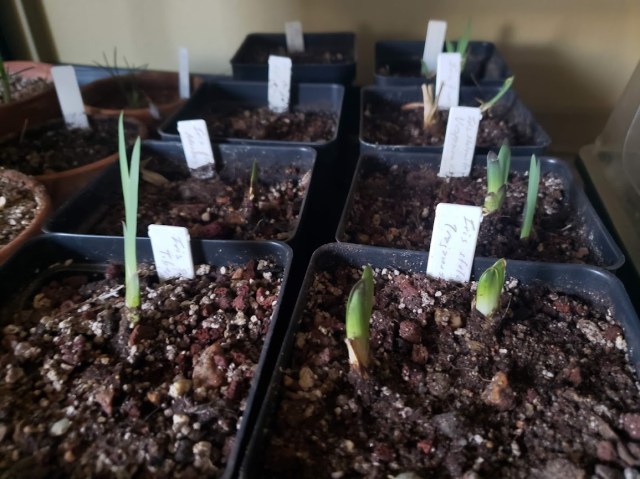 After quite a bit of careful watering, every single rhizome has now produced leaves. There was one, ‘Caligula’ (the Iris stolonifera are collections from near a village called Sina in Uzbekistan, and named for Roman emperors), third pot back in the left row, that wasn’t doing anything, but it produced a leaf a couple of nights ago. There were no leaves during the day, and then the next morning there was a leaf. Just like that.