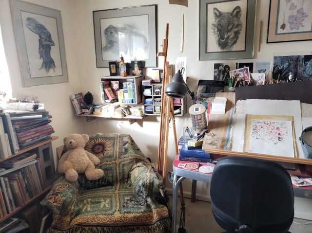 There are lots of books on art, his wife’s pencil drawings, including the wolf (first drawing she ever did), the crocus that hung in the Smithsonian for a while, the collection of tarot card decks from all over the world (purchased for the artwork), and the slide magnifier made out of a coffee can.