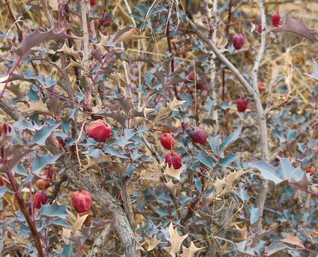 The birds didn’t get the fruit on Mahonia fremontii (the one growing in the back yard), and so it looks sort of seasonal now.
