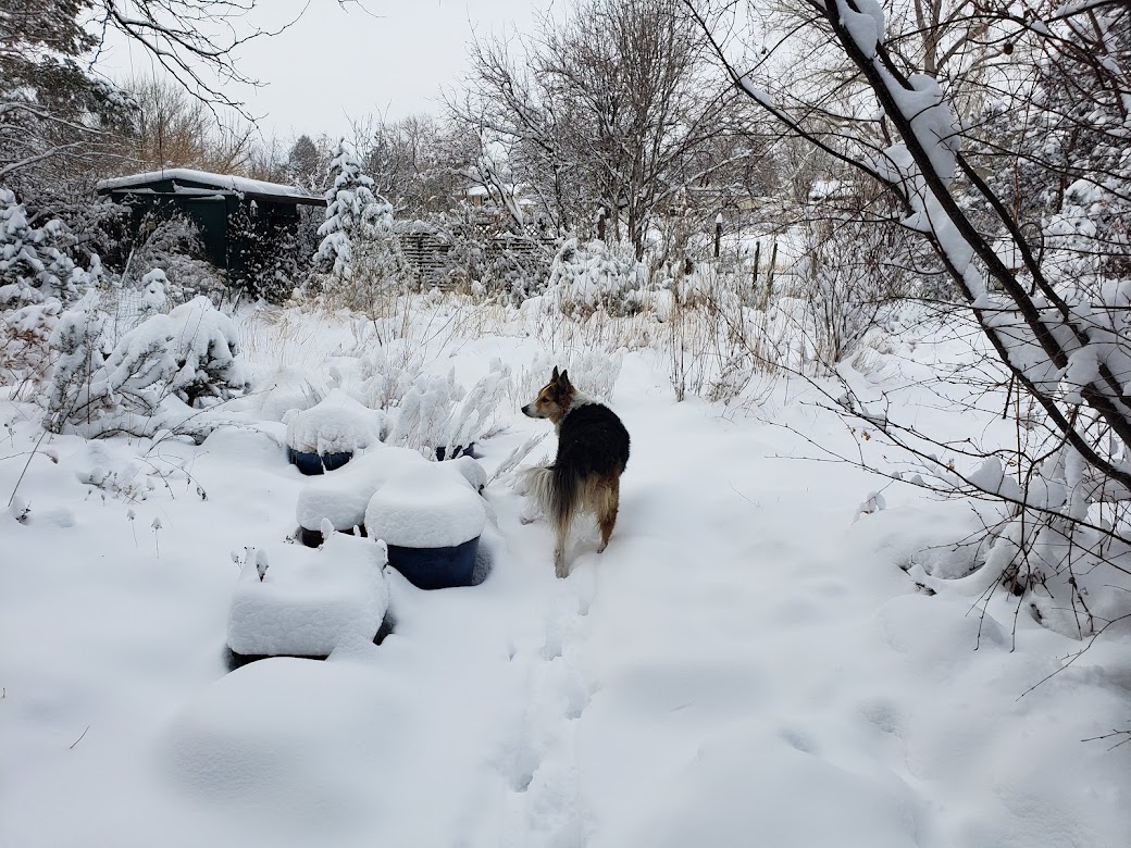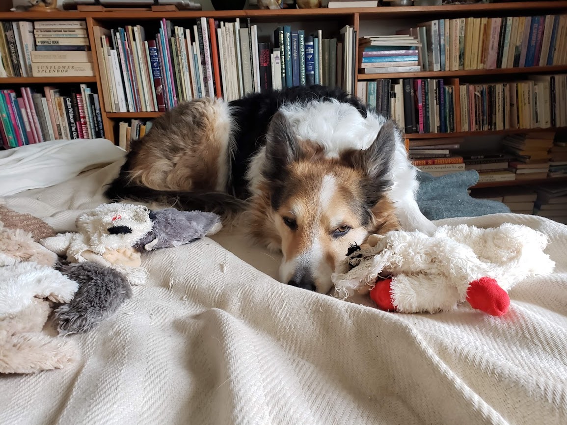 As others have mentioned, Lamb Chop was the first thing I noticed (after the snow)! My latest not-pure-bred Border collie doesn’t have a Lamb Chop, they make me too sad since the not-pure-bred Border collie before him loved them. And honking hedgehogs. He had stuffless foxes he dips in the water bowl.
