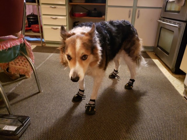 Thanks; I know wearing boots is the smart thing to do. At least the boots aren’t pink, less the ones Chess, the purebred border collie who lived here before me, had to wear. (The guy I live with said it was the only color available at the time.)