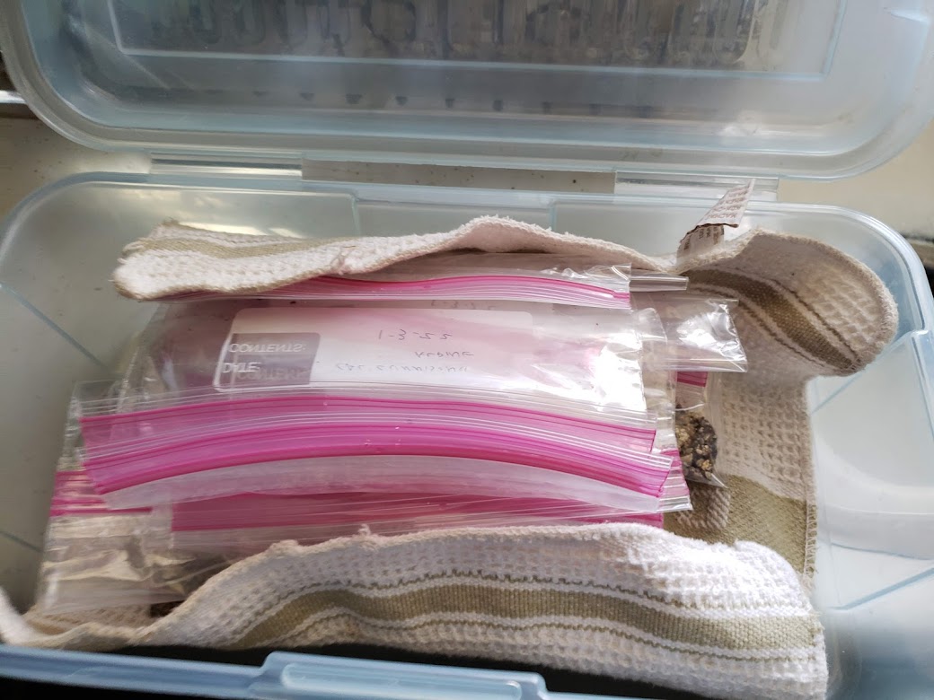 Then the plastic bags go into this box, wrapped in towels so they don’t freeze (like if the refrigerator decides to freeze things for some reason), and put in the crisper drawer in the refrigerator.