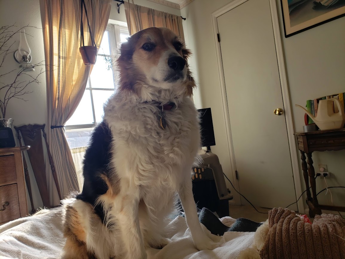Retractable ears are indeed excellent. The guy I live with often does see me first thing, lying on the bed in the morning, though sometimes I like to sleep in the chair down in the living room. Other purebred border collies who’ve lived here slept in that chair, too. He would rather have me sleep on the bed next to him, though.