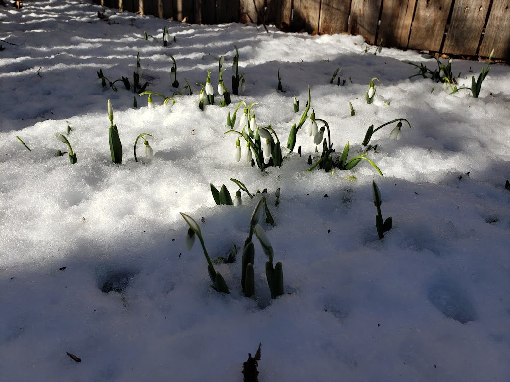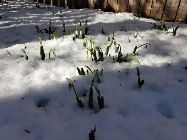 Other snowdrops in the garden haven’t done so well, because the soil in which most of them were planted froze fairly early in the winter. (The soil in the shade garden isn’t frozen, just covered with snow.) I guess it was a miscalculation, but the soil here really didn’t start freezing until just a few winters ago. These snowdrops will be moved later this year to part of the garden where the soil doesn’t freeze.