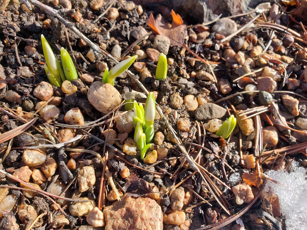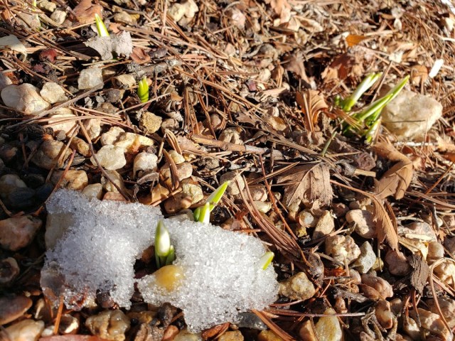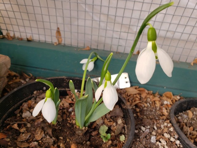 The frame really doesn’t protect the snowdrops from cold, so much as it protects them from snow. The soil in the pots would freeze, which isn’t a bad thing except that it slows down growth.