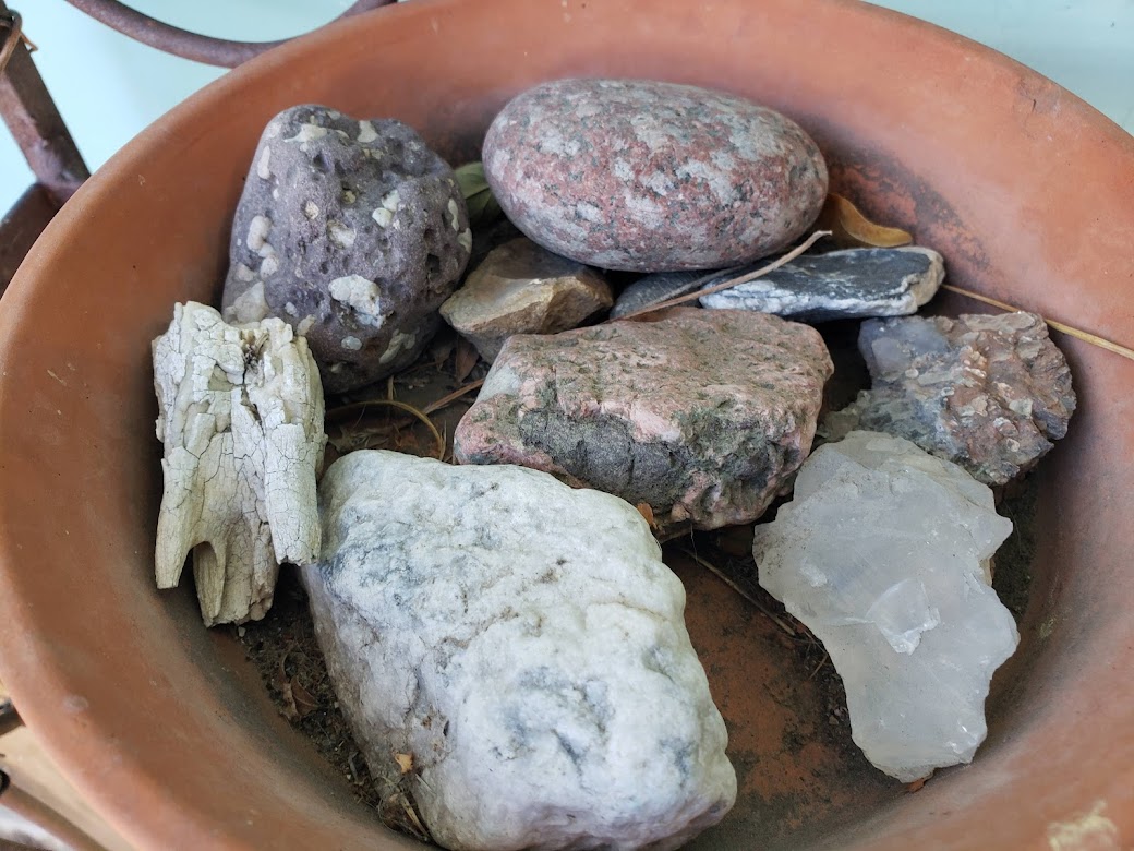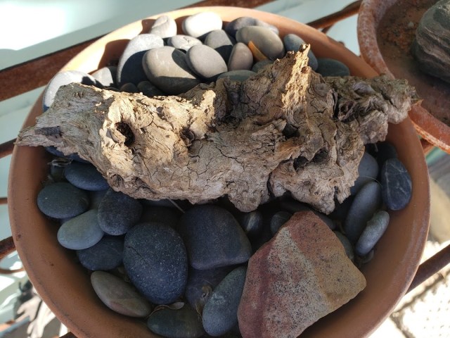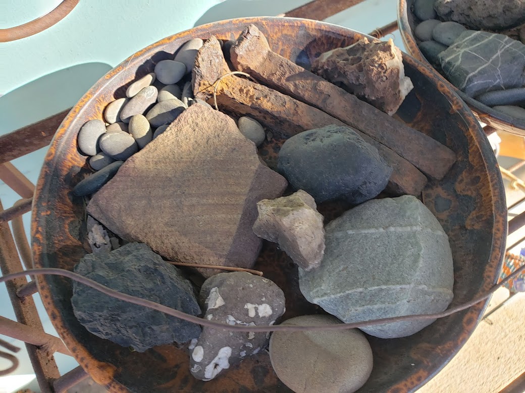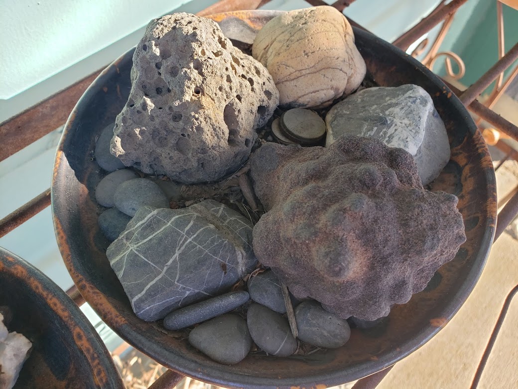 And now, I’m not sure why, I’m supposed to show the collection of rocks that sit in dishes out on the patio. The guy I live with said to, so I will. These don’t have anything to do with the color white, except there is an old bone in one of the dishes.