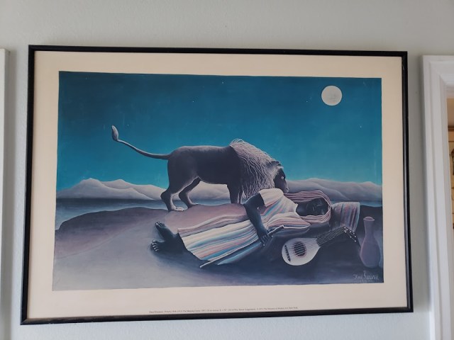 “The Sleeping Gipsy”, by Henri Rousseau. Not the real thing, of course, because if it were, we’d have a secretary doing this blog, but instead a print that the guy I live with has had for about fifty years. (It’s straighter than it looks.)