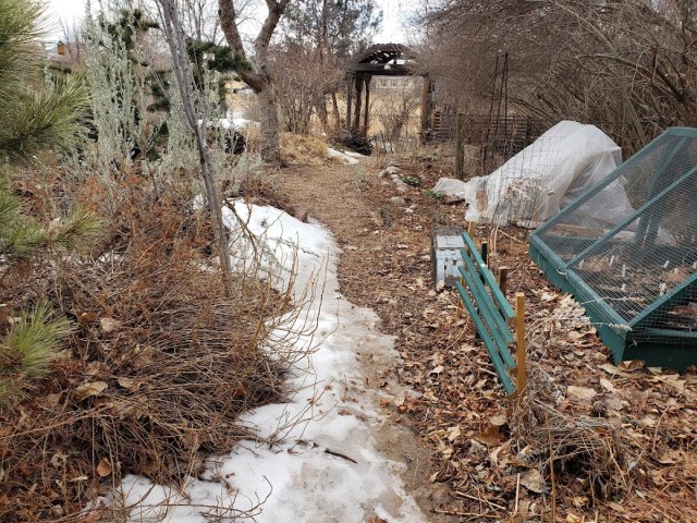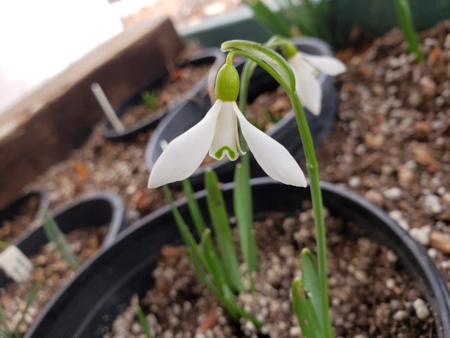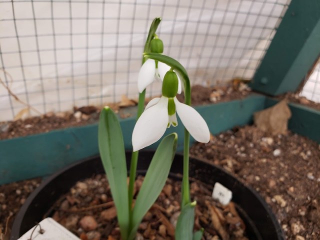 Not much else is happening here. There are snowdrops in flower in the frame, which is the farthest one away in this picture. Yes, the plastic-covered frame is ugly.