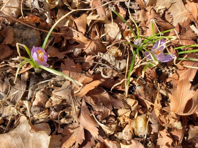 And finally, Crocus laevigatus is sort of flowering. This typically flowers earlier, but the soil has been pretty cold here.