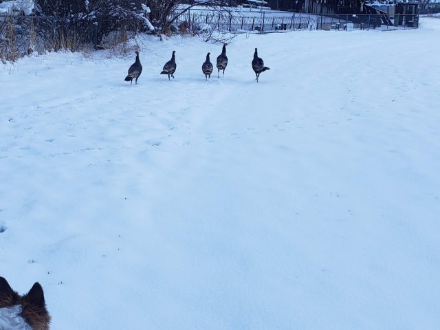 ” The turkeys were looking into our yard.” You don’t want them in the garden. They can scratch up a real mess.